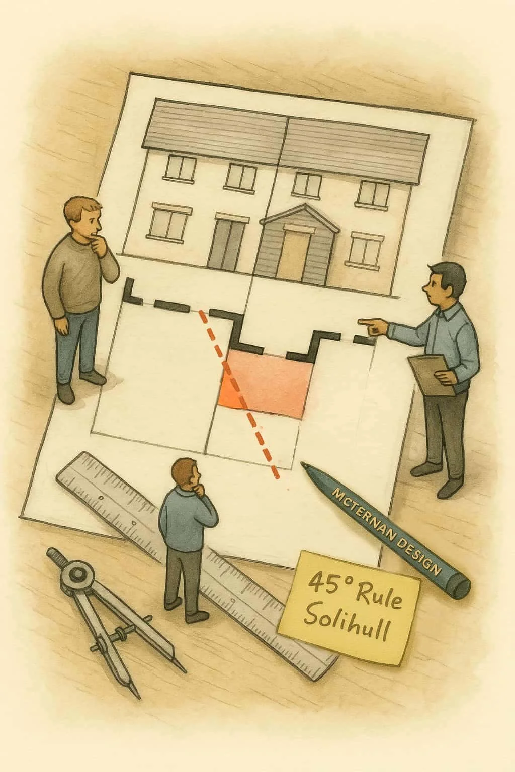 For householder planning applications, Solihull Council applies the 45-degree code to safeguard neighbours’ daylight. If your extension crosses a 45-degree line drawn from the centre of a neighbour’s main window, the application can be rejected. We use 3D modelling and daylight studies in areas such as Knowle and Hampton-in-Arden to verify compliance.